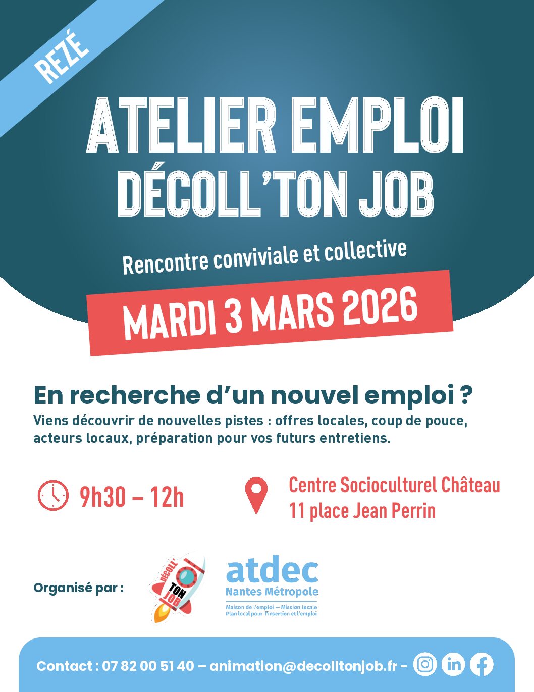 De 9h30 à 12h, Décoll’ton Job et Territoire Zero Chômeur de Longue Durée vous accueillent au CSC Château à Rezé pour un atelier emploi animé par Décoll’ton Job. Venez découvrir des offres d’emploi, de formation et des événements emploi disponibles dans la métropole nantaise.