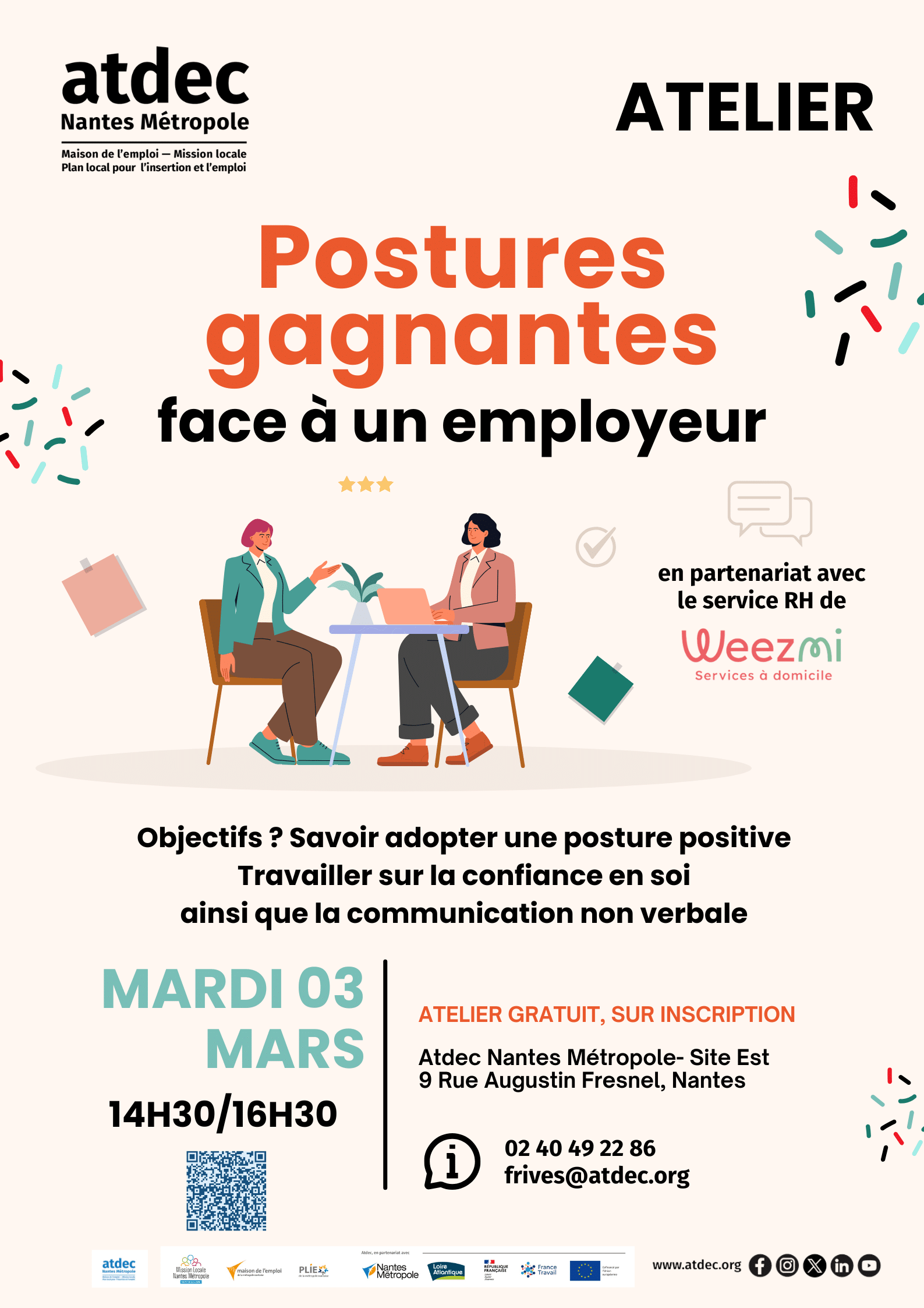 Cet atelier va vous montrer et vous expliquer l’enjeu d’adopter des postures positives et gagnantes face à un employeur afin de vous donner plus de chances de réussir professionnellement ( rencontre avec un employeur, entretien…).