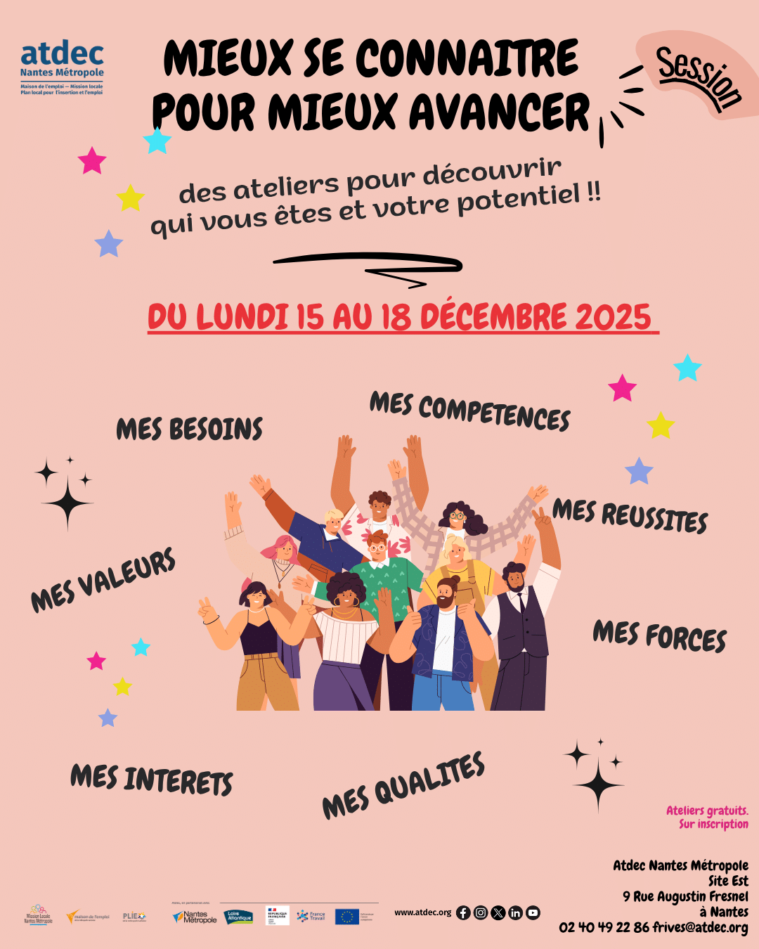 Apprendre à se mieux se connaître c’est avant tout prendre conscience de soi, de ses valeurs, de ses qualités, de ses compétences… A travers plusieurs ateliers, découvrez qui vous êtes, vos aptitudes, vos capacités, votre potentiel et reprenez confiance en vous !