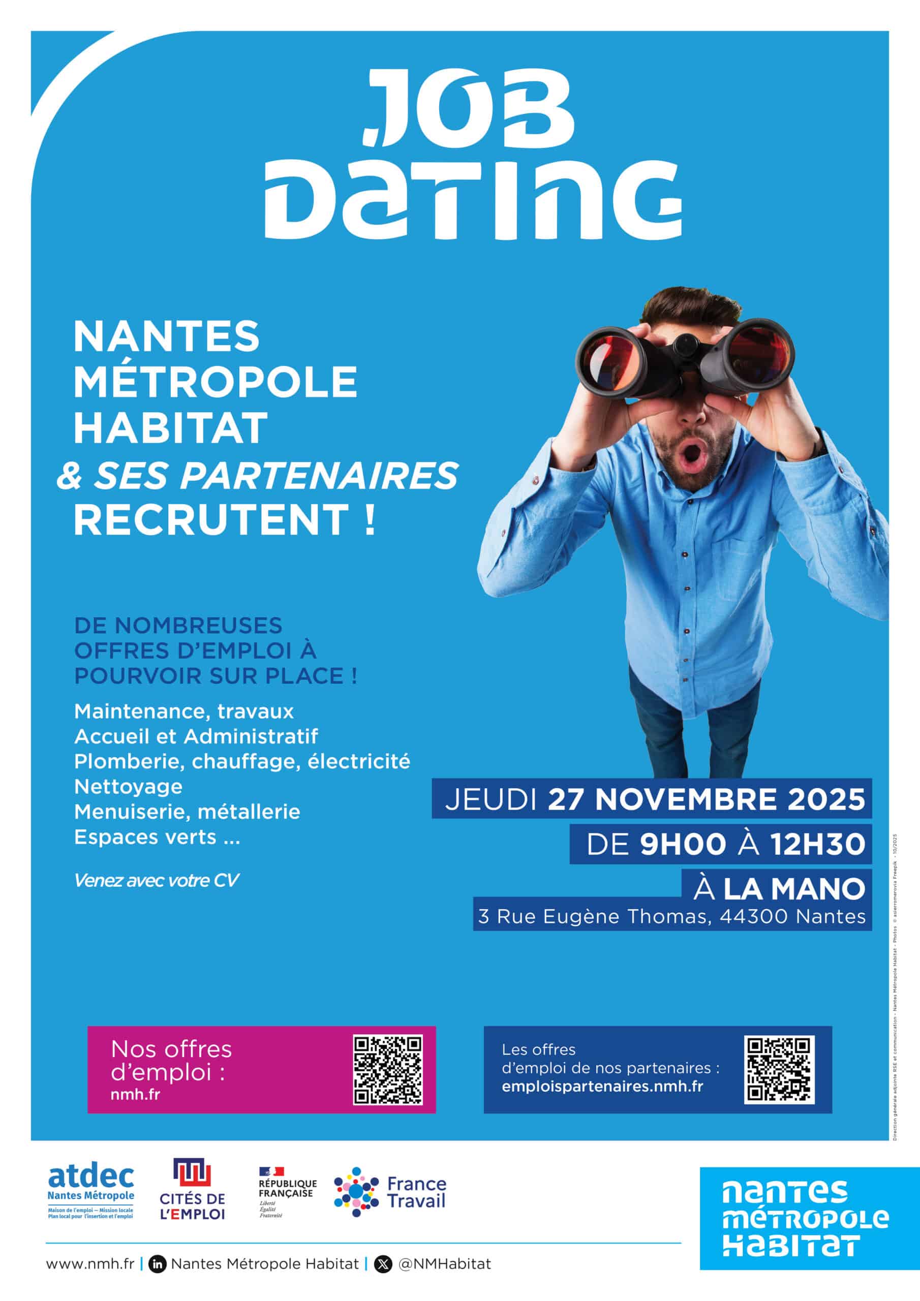 Nantes Métropole Habitat, en partenariat avec l’ATDEC de Nantes Métropole, organise un Job-dating le 27 novembre 2025, de 9h00 à 12h30 à la maison de quartier La Mano, à Nantes.