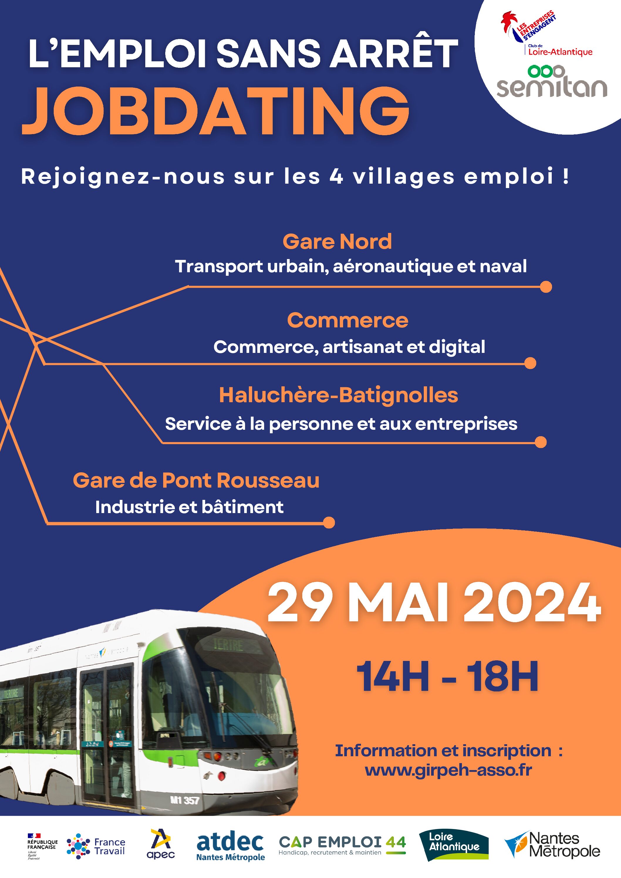 14h à 18h Jobdating « L’emploi sans arrêt » – 4 villages répartis sur des arrêts stratégiques à Nantes : • Gare Nord : Village du transport urbain, aéronautique et naval • Gare de Pont-Rousseau : Village de l’industrie et du bâtiment • Commerce : Village du commerce, de l’artisanat et du digital • Haluchère-Batignolles…