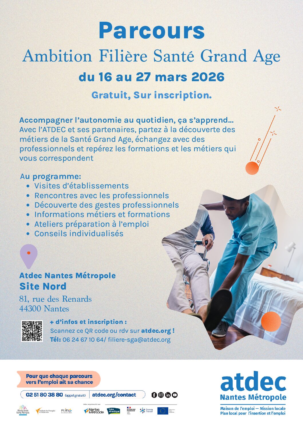 Vous recherchez un métier humain, un métier qui a du sens ! Vous aimez aider et accompagner ! L’ATDEC vous propose un parcours visant à découvrir les opportunités d’emploi et de formation du secteur de la Santé et du Grand Age, à tester les gestes professionnels et valider votre projet