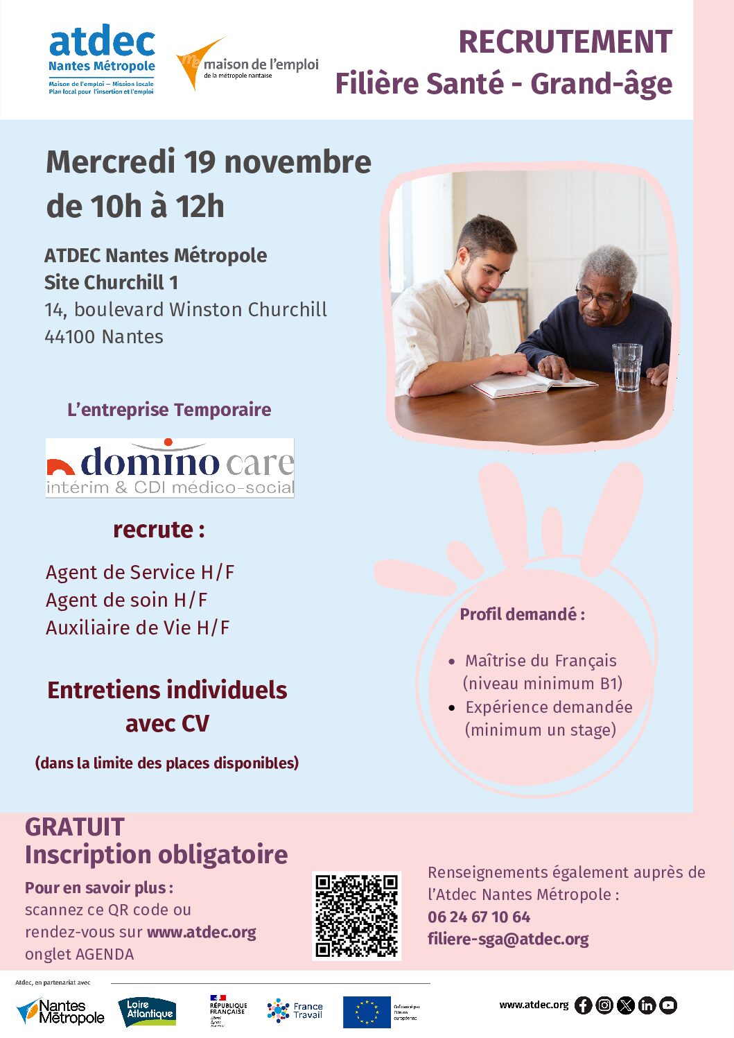 Postes proposés : Agent de Service Hôtelier ou Hospitalier H/F, Agent de soin H/F, Auxiliaire de Vie H/F