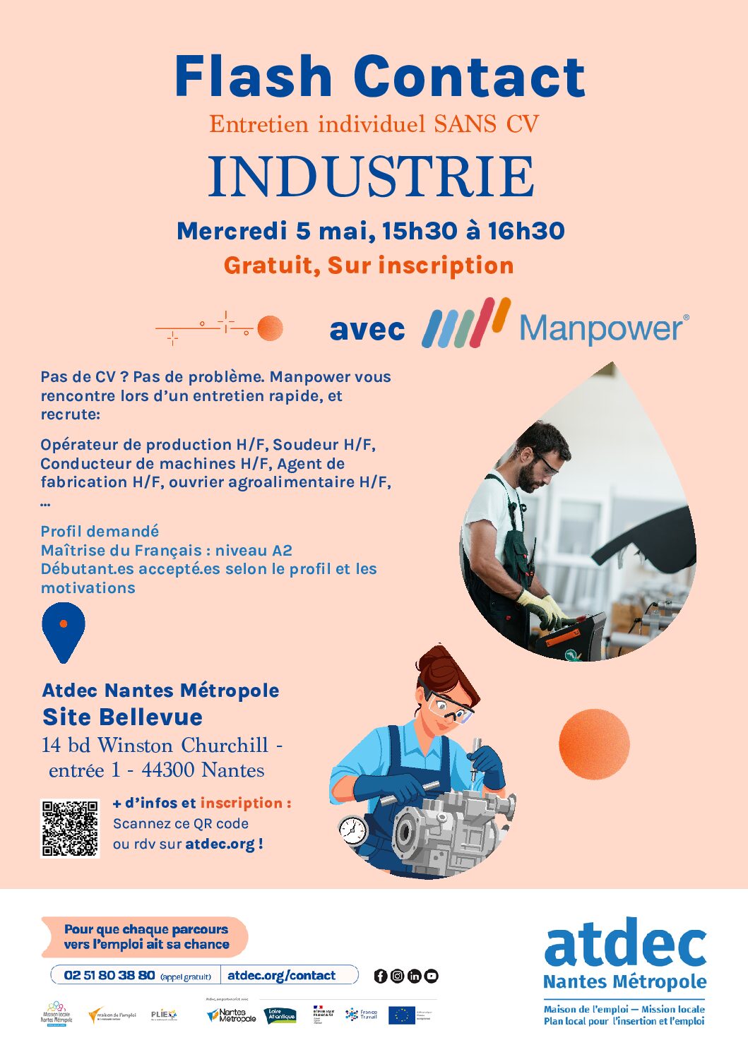 (si c’est complet, vous pouvez vous inscrire sur l’autre créneau, dont voici le lien :Recrutement – FLASH CONTACT Industrie (créneau de 14h30) – Atdec Nantes Métropole)