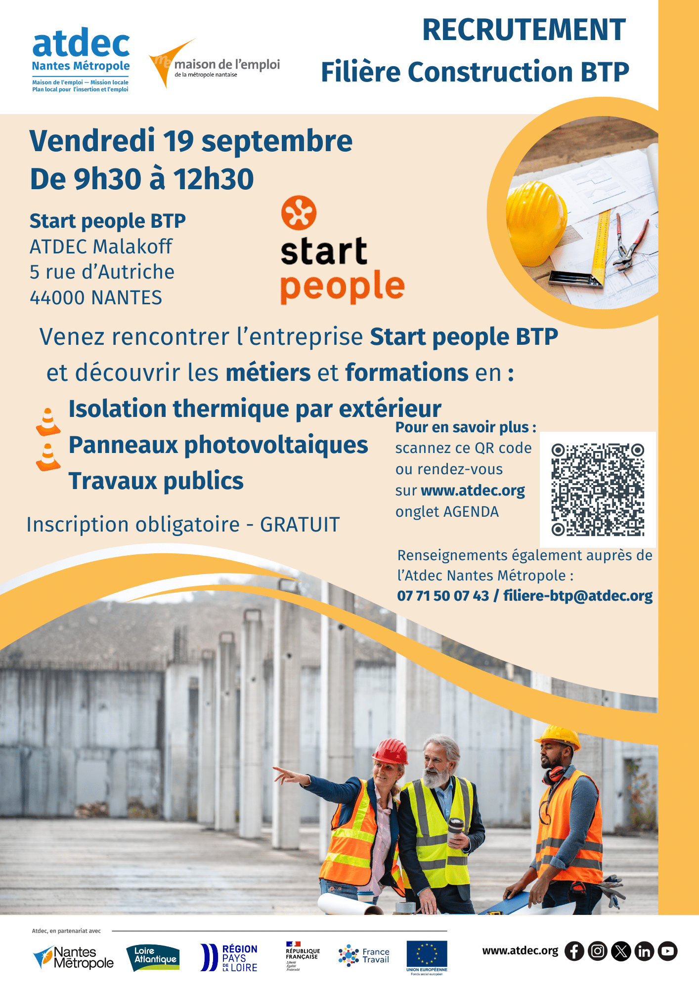 Recrutement pour des formations en ITE (Isolation thermique par extérieur), panneaux photovoltaïques et Travaux publics avec l’agence Start people BTP