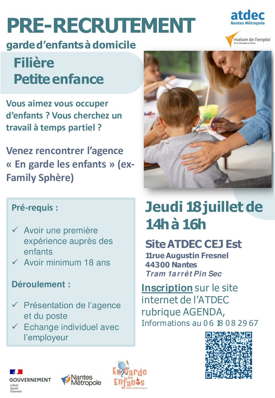 Venez rencontrer l’agence « En garde les enfants » (ex-Family Sphère) dans le cadre d’un pré-recrutement garde d’enfants à domicile. De nombreux postes sont à pourvoir pour la rentrée, principalement sur Nantes.