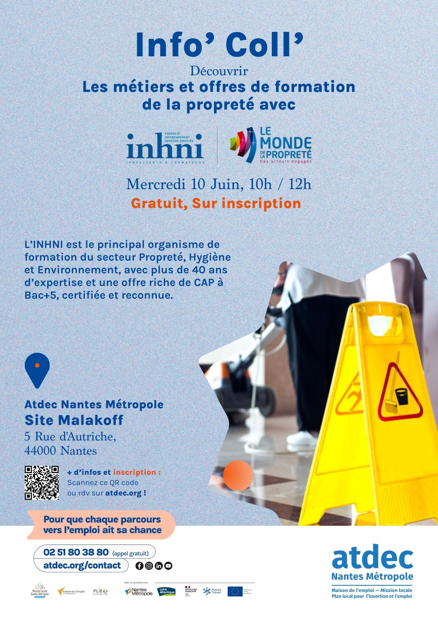 Tu es curieux·se, motivé·e, en recherche de formation ou de reconversion ? L’INHNI, organisme de formation dans les secteurs de l’hygiène, de la propreté et de l’environnement, t’invite à une information collective sur le site de l’ATDEC Malakoff !