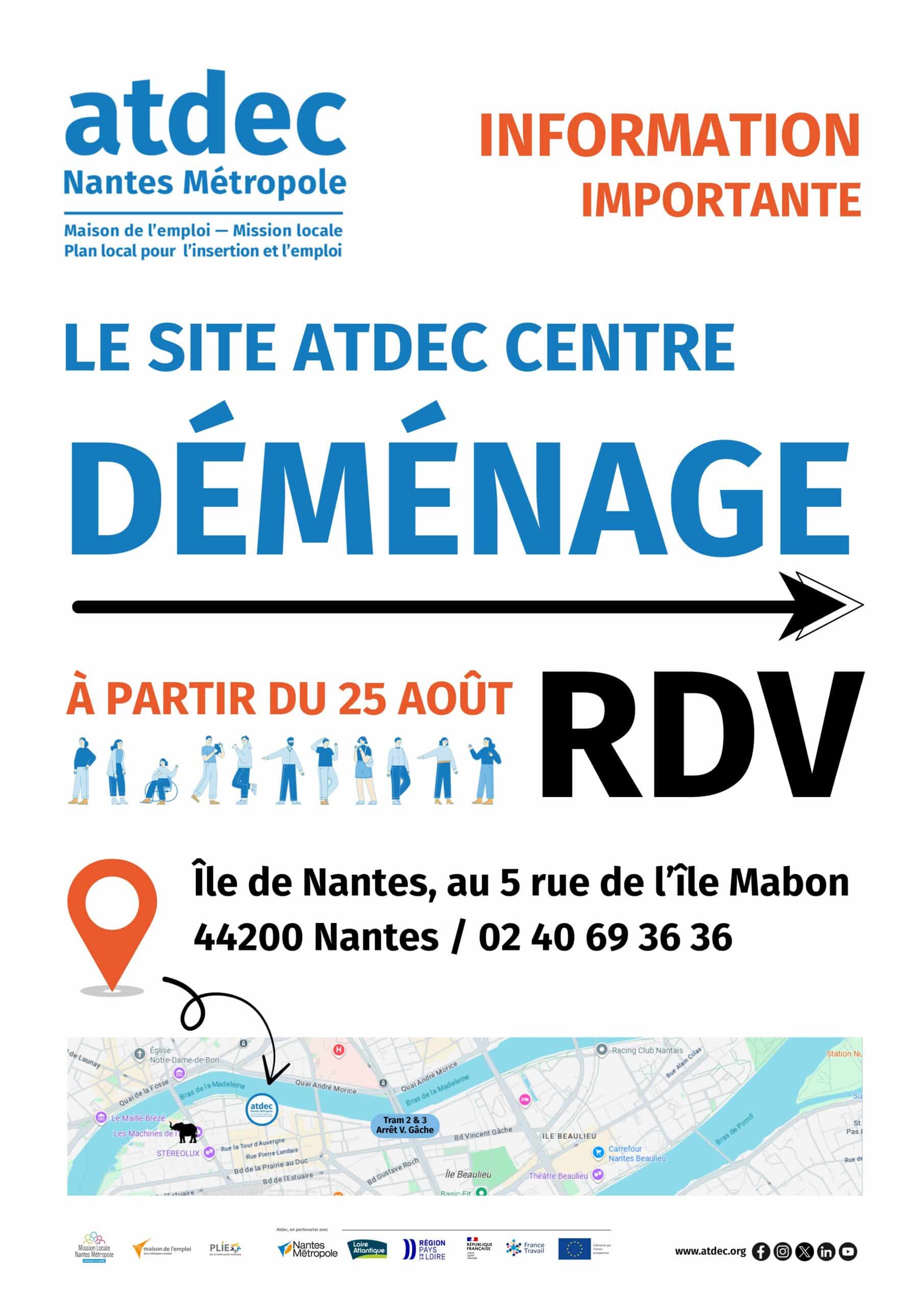 Le site Atdec Centre, et son espace CYBER, situé à Nantes, au 54 Boulevard Jean XXIII, déménage au 5 rue de l’île Mabon, sur l’île de Nantes. Les coordonnées mail & téléphonique ne changent pas pour le site Atdec Centre.