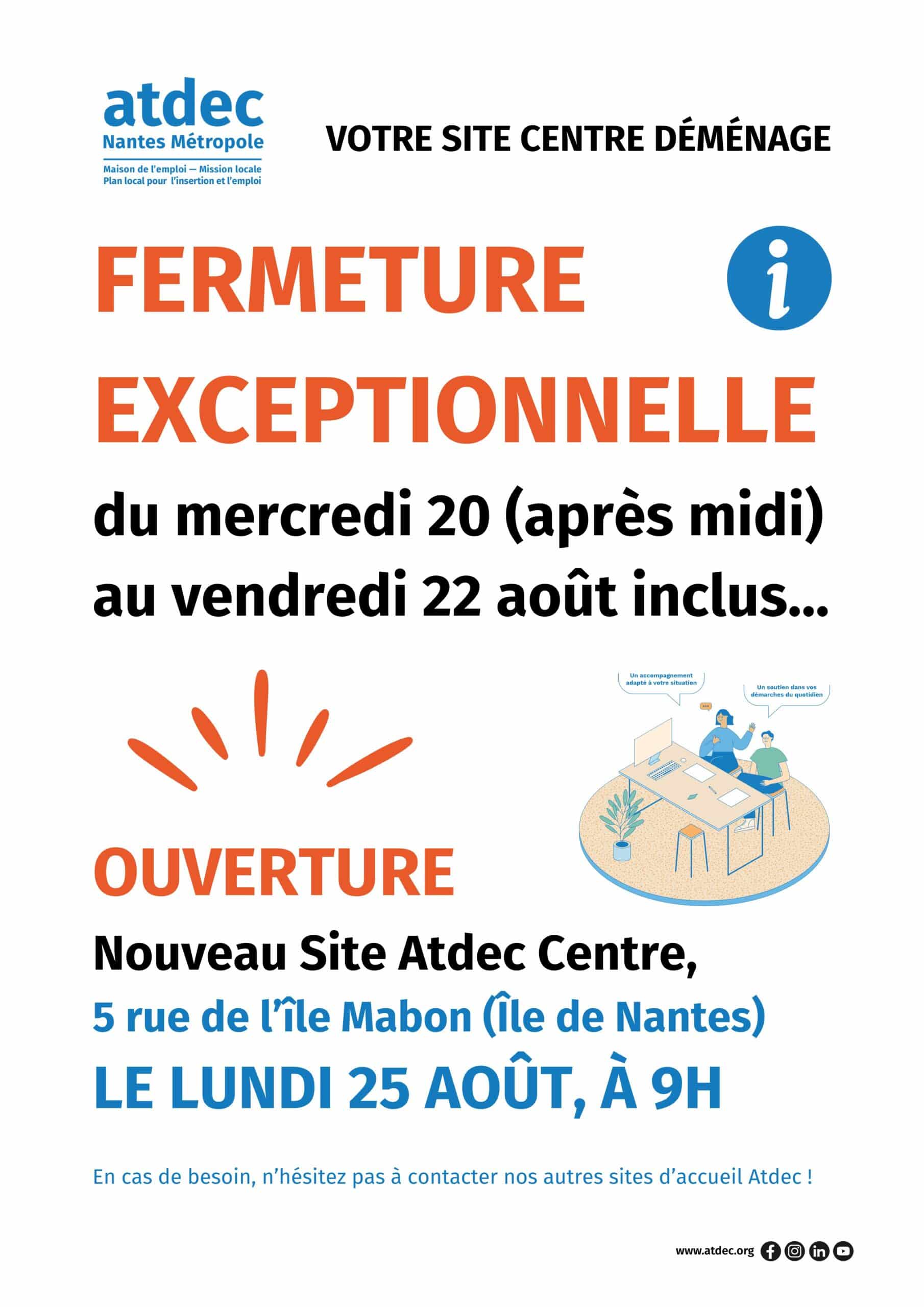 ATTENTION : fermeture exceptionnelle, pour cause de déménagement donc, du site Atdec Centre du mercredi après-midi 20 août, à partir de 12h30, au vendredi 22 août inclus. Nous vous remercions de votre compréhension.