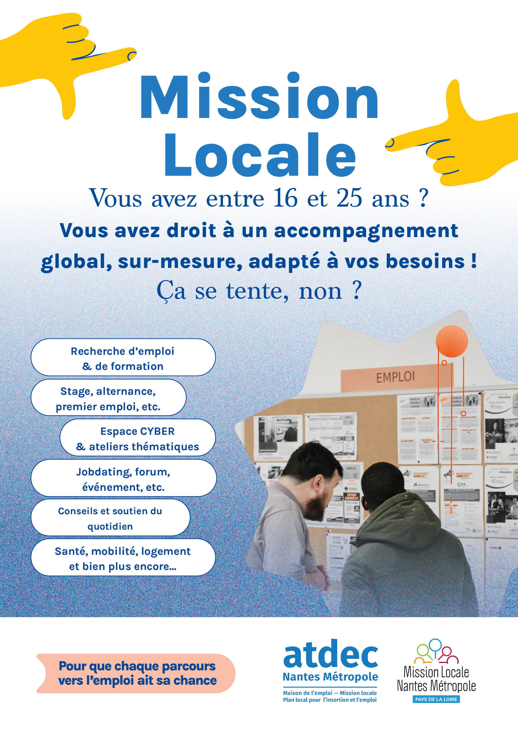 Si vous êtes résidents d’une des 24 communes de Nantes Métropole, l’Atdec Nantes Métropole, qui porte notamment l’activité Mission Locale sur le territoire métropolitain, sera votre structure d’accompagnement. En effet, l’Atdec Nantes Métropole rassemble différents dispositifs et activités tels que la Maison de l’emploi, la Mission Locale ou encore le Plan local pour l’insertion et l’emploi (PLIE) avec un objectif commun : faciliter l’accès à l’emploi pour toutes et tous ! Pour les moins de 26 ans, vous l’aurez compris, l’entrée principale est donc la Mission Locale au sein de l’Atdec…