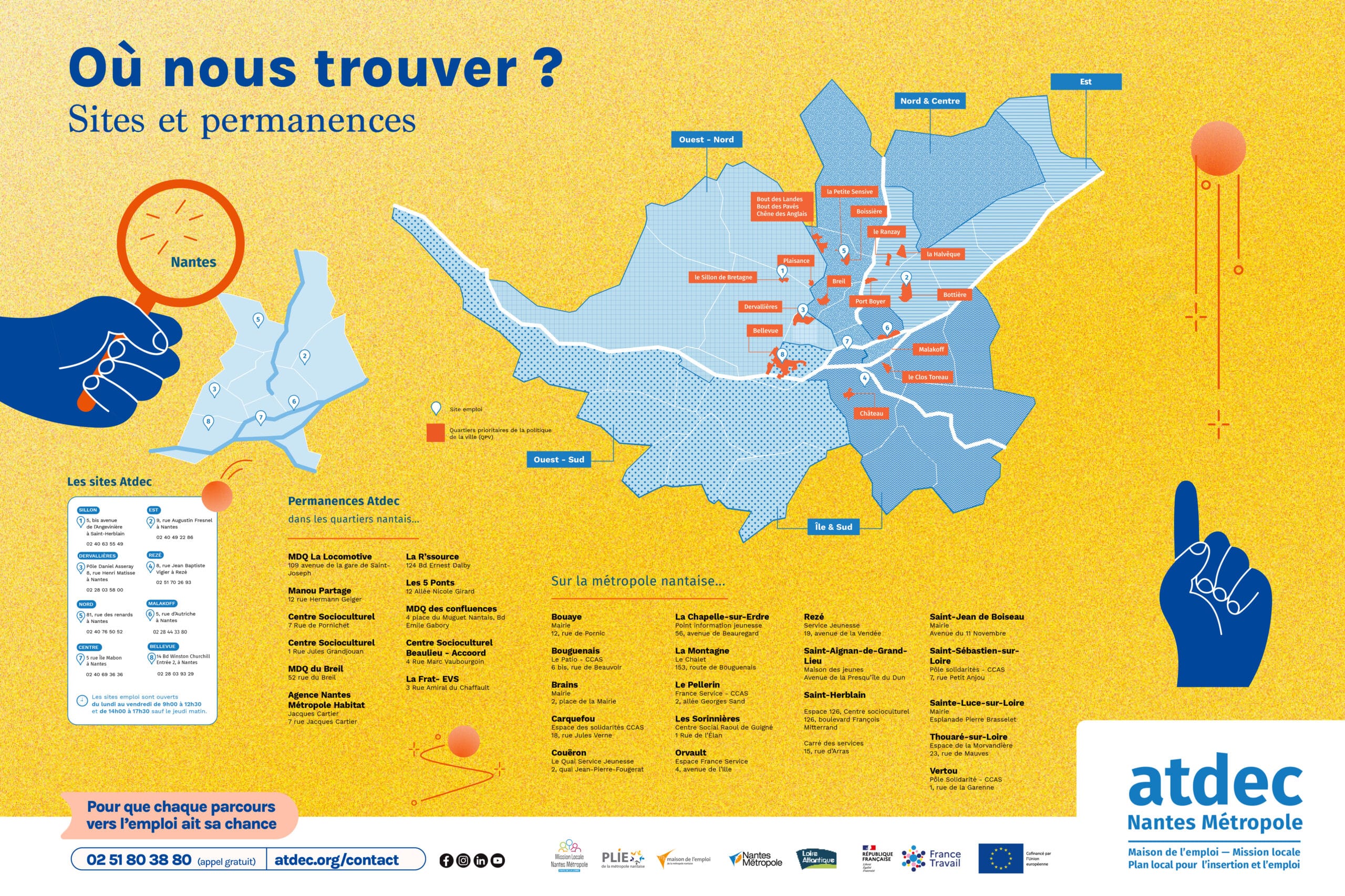 Attention : Nos sites d’accueil Atdec Nantes Métropole sont ouverts du lundi au vendredi, de 9h00 à 12h30 puis de 14h à 17h30 – excepté le jeudi matin, sites fermés au public. Pour les permanences, renseignez-vous auprès de l’Atdec ou directement auprès des communes ou structures partenaires.