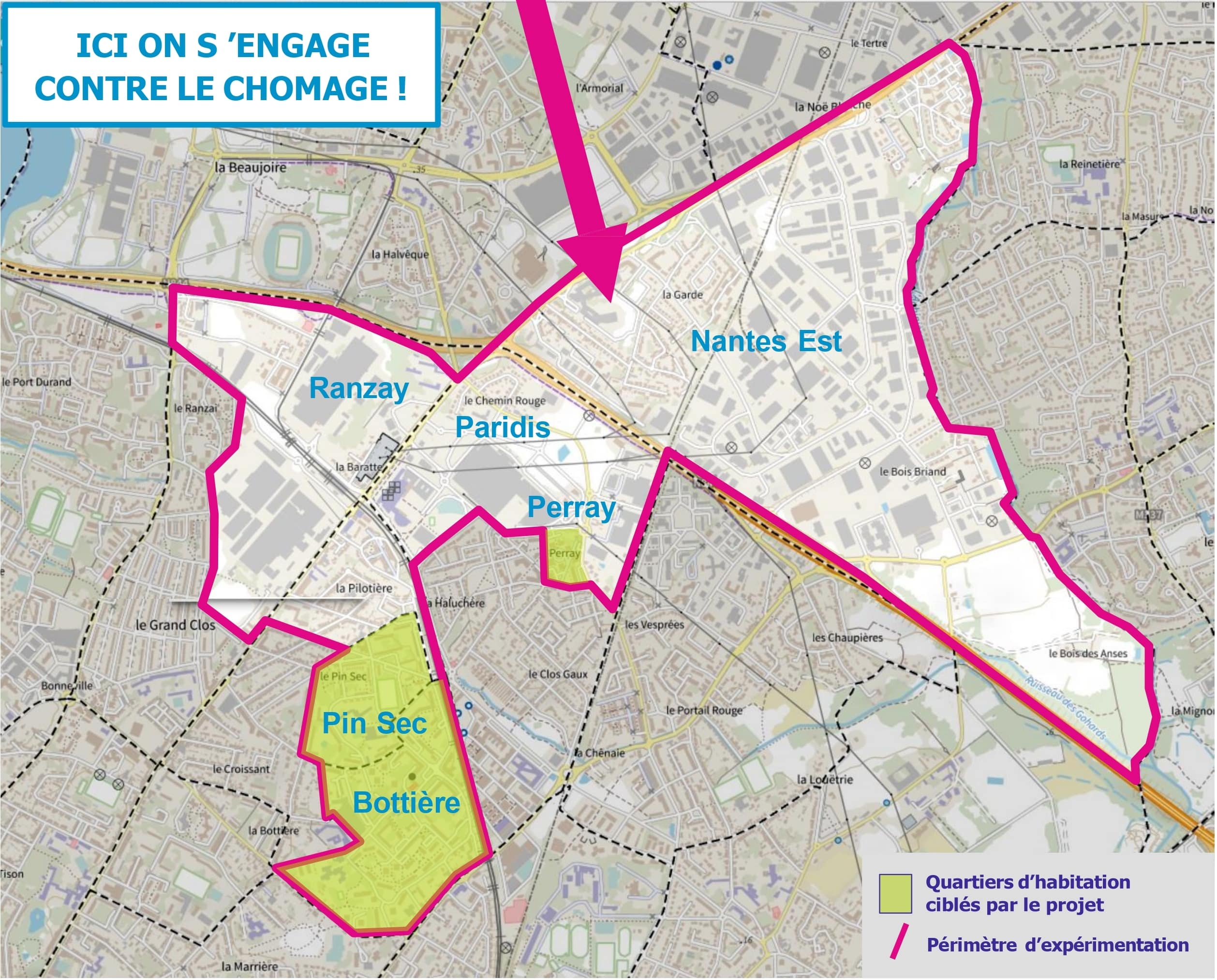 A Nantes, le projet TZCLD Nantes Est, dans le quartier Bottière – Pin-Sec – Perray, est piloté par La Belle Cordée Nantaise, Atdec Nantes Métropole, Partage 44, Solidarité emploi 44, avec le soutien de la Ville de Nantes et Nantes Métropole.